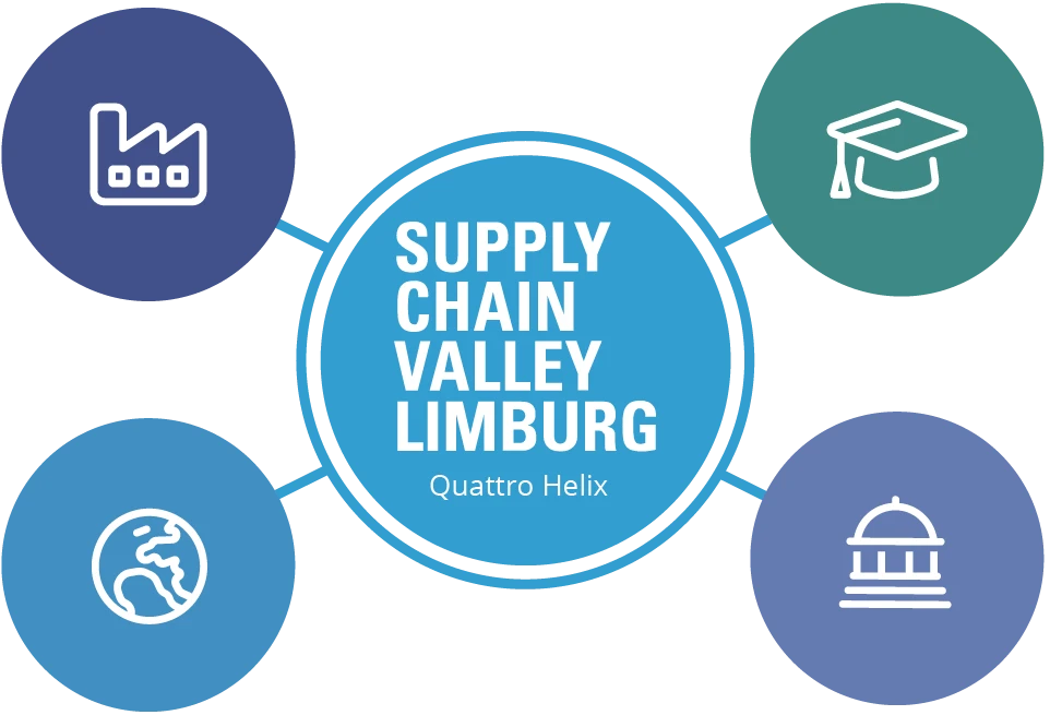 Das Supply Chain Valley Limburg (SCVL) ist eine Kooperation zwischen Wirtschaft, Wissenschaft, Politik und Gesellschaft: die sogenannte Quattro Helix. Es handelt sich um eine euregionale Initiative, die für Unternehmen in der Fertigungsindustrie, der Agrar- und Lebensmittelindustrie sowie der Logistik in der Region Nordlimburg und im Kreis Viersen gedacht ist. Das Supply Chain Valley Limburg wird von der Wirtschaft organisiert, finanziert und verwaltet, hat seinen Sitz in Venlo und stärkt die Region als Lieferketten- und Logistikdrehscheibe für Nordeuropa. Es ist die Lieferkette, die die Branchen Logistik, Agrar- und Lebensmittelindustrie und Fertigungsindustrie in der Region miteinander verbindet. Alle relevanten Unternehmen aus den Bereichen Lieferkettenmanagement, Logistik und Mobilität arbeiten im Valley zusammen, haben aber auch ausreichend Raum für eigene Aktivitäten. Durch die Zusammenarbeit verbessern wir unsere Denkfähigkeit und Umsetzungsstärke.
